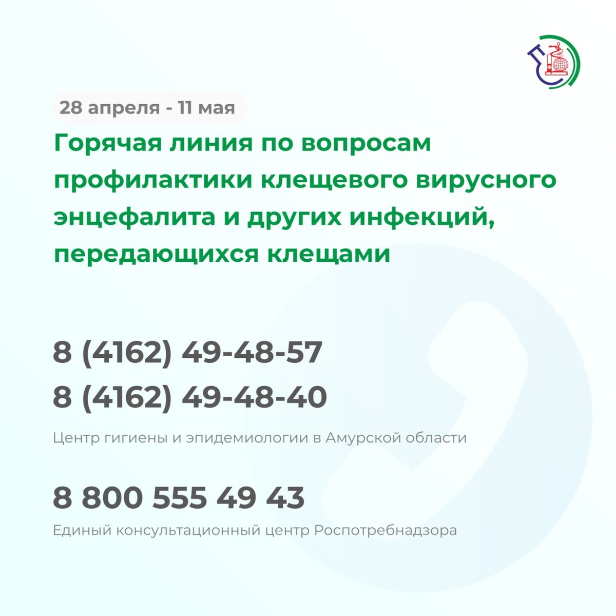 ☎️Роспотребнадзор проводит Всероссийскую горячую линию, посвященную профилактике клещевого энцефалита и других инфекций, передающихся клещами