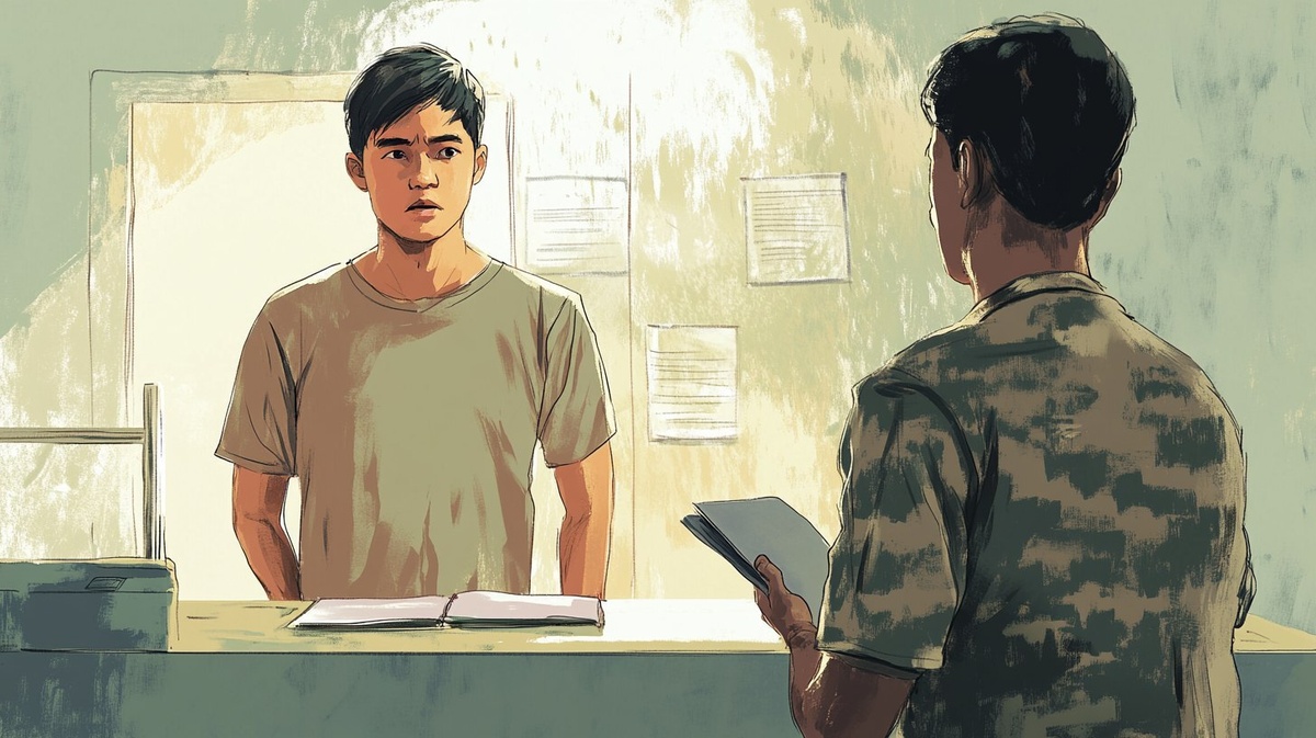 Создано на основе запроса: An illustration of a tense scene at an African airport immigration office. A asian 20-year-old man is standing nervously at immigration counterr. He was wearing a T-shirt. He In front of him, a stern-faced immigration officer in a military-style uniform glares at her while holding an open passport and a notebook. The room is plain, with peeling paint on the walls, a dusty floor, and a flickering fluorescent light overhead. The atmosphere feels heavy and intimidating. --- Автоперевод: Иллюстрация напряженной сцены в иммиграционном офисе африканского аэропорта. Классно получилось? 🤔 https://dzen.ru/id/65c0c65c86e4f837c27b24d7 #ИИ #AI #нейросеть #midjourney #art