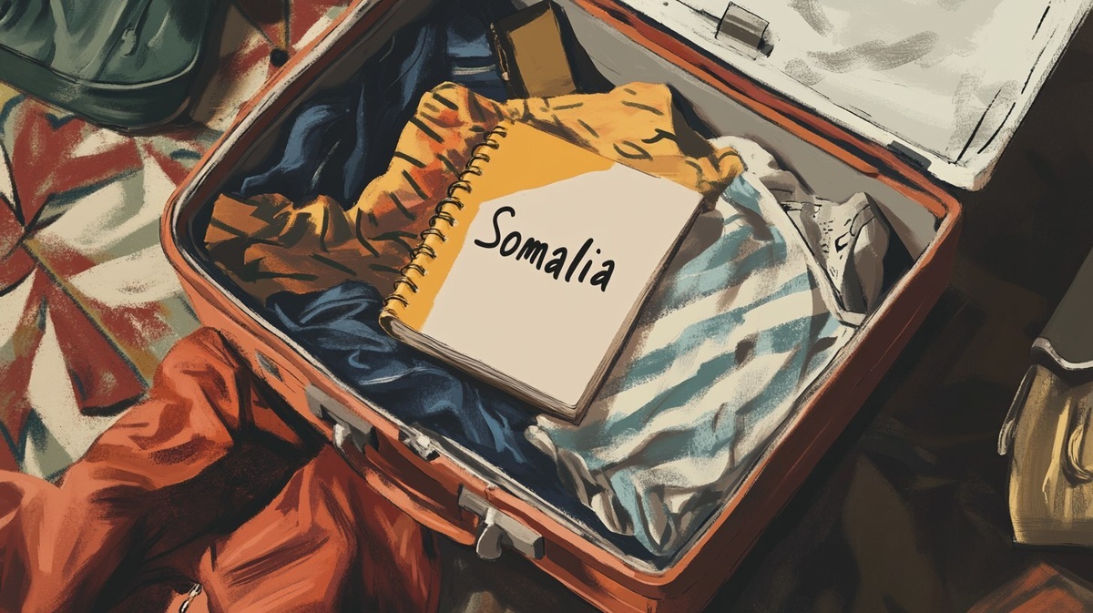 Создано на основе запроса: An illustration of an open suitcase lying on the floor. Inside the suitcase, clothes and travel items are scattered casually. On top of the belongings, there is a notebook clearly visible, with the word "Somalia" handwritten on its cover in bold letters. The suitcase looks slightly worn from travel, and the setting suggests a moment of transit, perhaps in an airport or a small room. The lighting is soft and natural, creating a sense of quiet tension and anticipation. --- Автоперевод: Иллюстрация открытого чемодана, лежащего на полу. Как тебе такой вариант? 🤔 https://dzen.ru/id/65c0c65c86e4f837c27b24d7 #ИИ #AI #нейросеть #midjourney #art