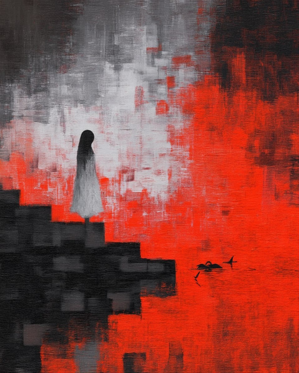 Создано на основе запроса: voxel eerie painting with a color scheme of monochromatic black and white with a pop of Color