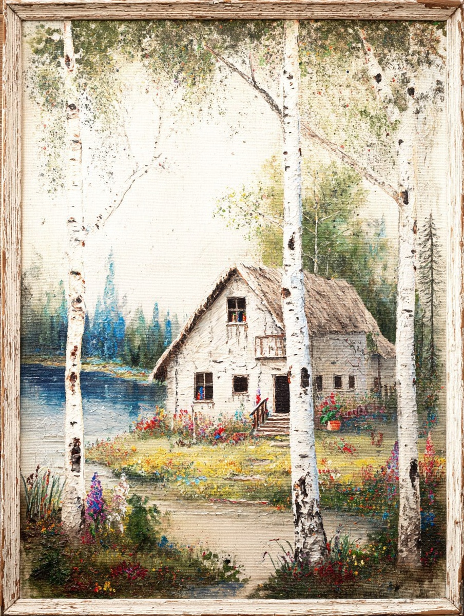 Создано на основе запроса: Vintage painting of a wooden frame with a white background. Vintage oil painting on canvas of a cabin in the woods, surrounded by birch trees and flowers next to a lake. Detailed, intricate details, beautiful, in the style of cottagecore. Delicate watercolor, muted color palette. --- Автоперевод: Винтажная картина деревянной рамы с белым фоном. Что думаешь? 🤔 https://dzen.ru/id/65c0c65c86e4f837c27b24d7 #ИИ #AI #нейросеть #midjourney #art