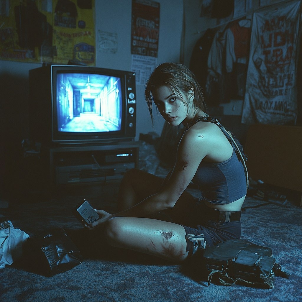 Создано на основе запроса: Grungy analog 35mm photo of Jill Valentine sitting cross-legged on the floor of a dark messy 90s bedroom, playing Resident Evil on a PlayStation 1, displayed on a small CRT TV. She’s holding a grey PS1 controller, mid-action, glancing back at the camera with a serious expression. A S.T.A.R.S. tactical vest is casually tossed beside her on the carpet. The TV glows faintly, showing a dark hallway from Resident Evil. Captured with raw disposable film camera, harsh paparazzi flash lighting, heavy grain, unedited, nostalgic late 90s vibe, cluttered room filled with survival gear, VHS horror tapes, and crumpled posters on the walls, candid unposed shot, cinematic low light. --- Автоперевод: Грангский аналоговый 35-миллиметровый фото Джилл Валентин, сидящий с ноги на полу темной грязной спальни 90-х годов, играя в Resident Evil на PlayStation 1, выставленную на небольшом телевизоре CRT. Красиво выглядит? 🤔 https://dzen.ru/id/65c0c65c86e4f837c27b24d7 #ИИ #AI #ней