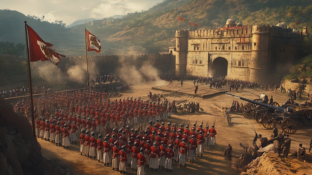 Создано на основе запроса: 18th century India, a large British army assembled in formation in front of a small rugged Indian fort, cannons