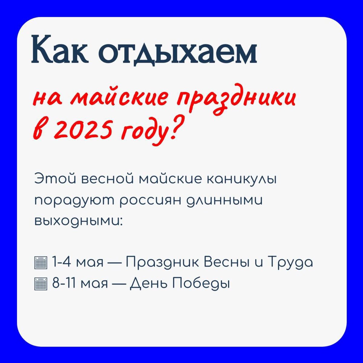 При этом в среду он будет сокращенным на час. А дальше — выходные до 5 мая, связанные с праздником Весны и труда. С 5 по 7 число вновь рабочие дни, последний из которых также будет сокращенным. 8 и 9 мая — выходные из-за празднования Дня Победы.