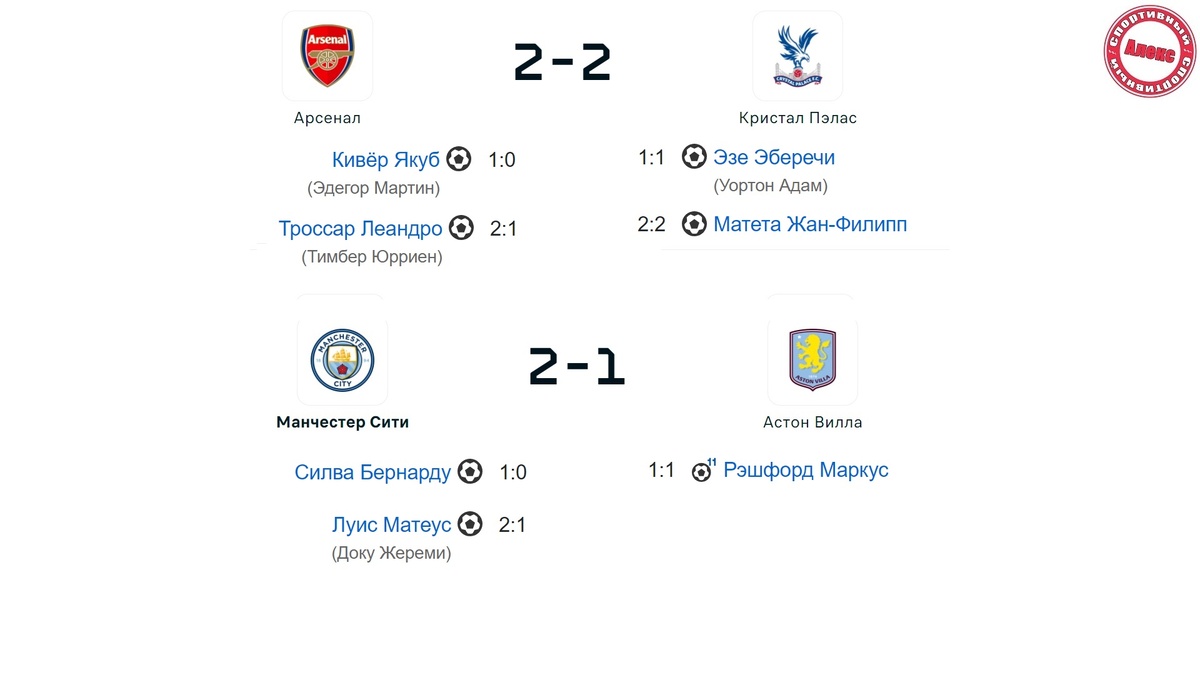 Друзья, состоялся 34 тур в английской премьер-лиге. В этом обзоре вас ждут результаты сыгранных матчей и турнирная таблица. Арсенал на «Эмирейтс» принимал Кристал Пэлас. «Гости» начинали с центра поля, но, когда мяч оказался у «канониров», Якуб Кивёр на 3-й минуте с навеса Эдегора в прыжке головой открыл счёт. В середине тайма Кристал Пэлас подал заготовленный угловой. Эзе Эберечи пробил с лёта и от штанги сравнял счёт (1:1). Арсенал 64% времени контролировал мяч и под перерыв забил второй свой гол. Троссард получил проникающую передачу, пробил из-под защитника и мяч от рикошета медленно влетел в ворота соперника (2:1). В дебюте второй половины Троссард должен был делать дубль, но счет не изменился. Арсенал имел ещё ряд выгодных моментов, но на 82-й минуте Кристал Пэлас перехватил мяч. Матета, 4 минуты назад вышедший на замену, черпачком забил отличный мяч в пустые ворота (2:2). В следующем туре Арсенал сыграет с Борнмутом. Манчестер Сити принимал Астон Виллу. В первой же атаке Рэшфорд