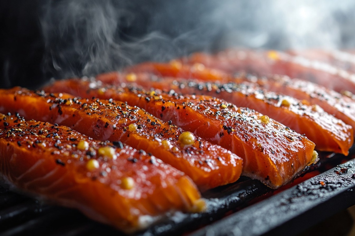 Создано на основе запроса: Title: Salmon Jerky In Smoker | STYLE: Close-up Shot right view | EMOTION: realistic as possible | SCENE: KEYWORD
