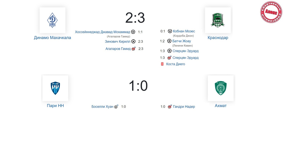 Друзья, состоялся 26 тур в российской премьер-лиге. В этом обзоре вас ждут результаты сыгранных матчей и турнирная таблица. Махачкалинское Динамо принимало лидера Краснодар. Уже на 6-й минуте «быки» вышли вперед. После «неразберихи» в штрафной Мозес послал «круглый» в сетку (0:1). В середине тайма иранский нападающий «Динамо» Джавад Мохаммад устанавливает на табло статус – кво (1:1). Динамо забивает в 20 матчах РПЛ подряд и устанавливает клубный рекорд. Жоау Батчи из «Краснодара» забивает выход один в один на 45-й минуте (1:2). На 65-й пушечный удар из-за штрафной наносит Эдуаррд Сперцян (1:3). Через мгновение Сперцян не реализует пенальти, пробив выше ворот. На 79-й Диего Коста удаляется с поля. «Быки» завершают матч в меньшинстве. На 86-й Кирилл Зинович со штрафной точно кладёт мяч в сетку. В компенсированное время на 101 минуте Гамид Агаларов упускает возможность сравнять счет и не реализует пенальти. Победа Краснодара 3:2. В следующем туре «быки» примут на своём поле Рубин. Нижний