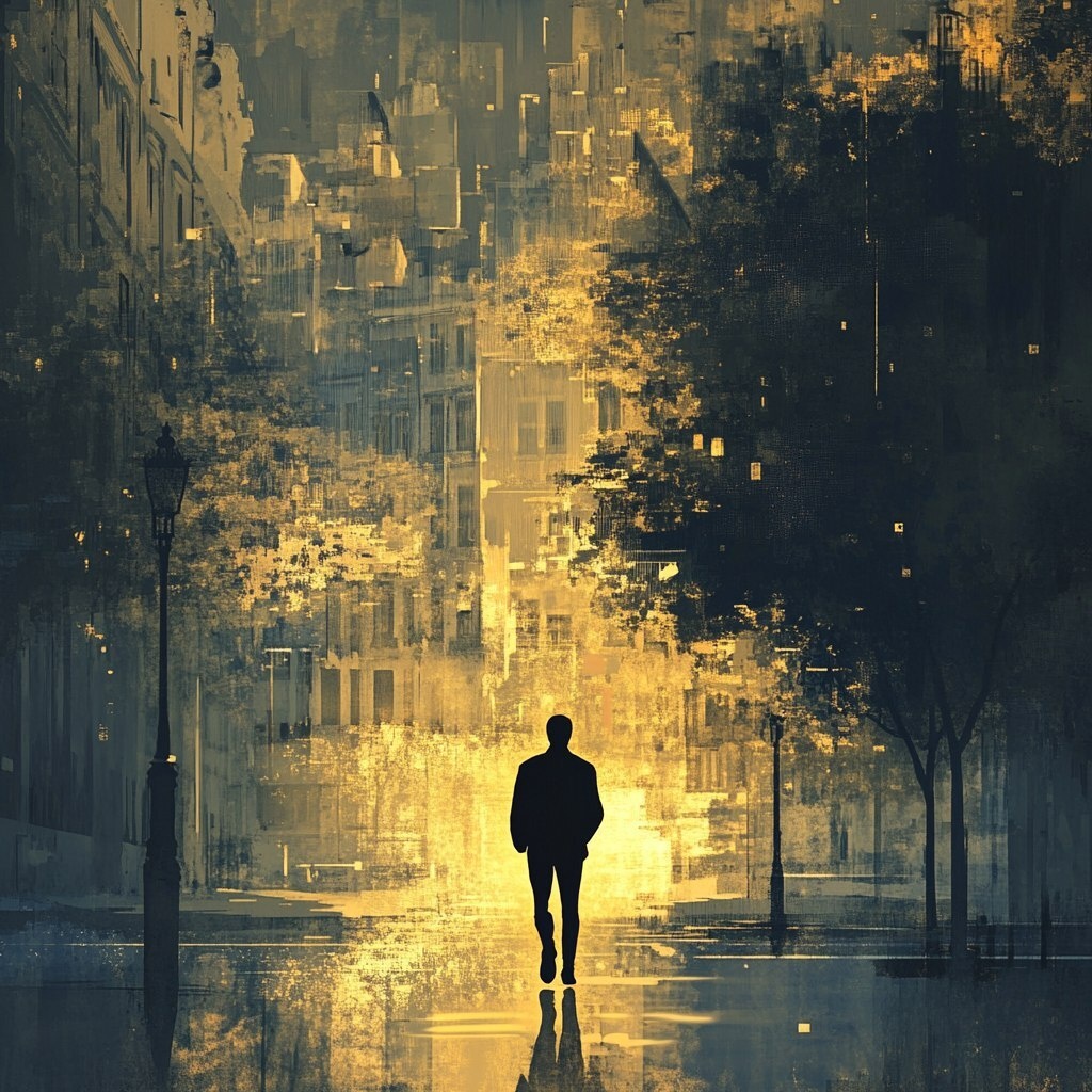 Создано на основе запроса: Create a minimalist book cover featuring a young man's silhouette walking alone through an urban landscape blending old buildings and trees. The scene should be slightly blurred, with soft golden light breaking through the background, symbolizing hope. Use a color palette of grays, cold blues, and touches of gold. The mood should be introspective, emotional, and realistic. voxel --- Автоперевод: Создайте минималистскую обложку книги с участием силуэта молодого человека, ходящего в одиночестве по городскому ландшафту, смешивая старые здания и деревья. Неплохо получилось? 🤔 https://dzen.ru/id/65c0c65c86e4f837c27b24d7 #ИИ #AI #нейросеть #midjourney #art