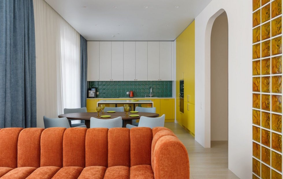 Интерьер полностью отражает стилистику бюро Collage.Studio — это использование экологичных материалов и любовь к цвету, стеклоблокам и фактурному текстилю Место: Воронеж Тип дома: Новостройка Метраж: 118,4 кв. м Год реализации: 2024 Комнаты: 3 Cанузлы: 2 Высота потолков: 3 м Питомцы: Собака Дизайн: Collage.Studio Фото: Андрей Кирнов Проект создавался для молодой семьи. Они обратились к дизайнерам из бюро Collage.Studio с просьбой оформить интерьер в трехкомнатной квартире. Заказчикам хотелось наполнить свое новое жилье сочными красками и необычными решениями в виде арок, стеклоблоков, керамики. Также важно было, чтобы пространство было максимально открытым и функциональным. Квартиру фактически поделили на две части: общую и приватную. Разделяет их просторный коридор-прихожая со встроенными системами хранения при входе. В кухню-гостиную ведут два открытых входа в виде арок, между которыми сделали вставку из цветных стеклоблоков — днем в коридор попадает дополнительный свет. В квартире