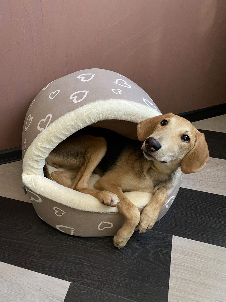 Малышка метис с гончей, поджарого телосложения, миниатюрная ростом чуть ниже колена, вес 8 кг, подвижная и отзывчивая к командам и любому общению.