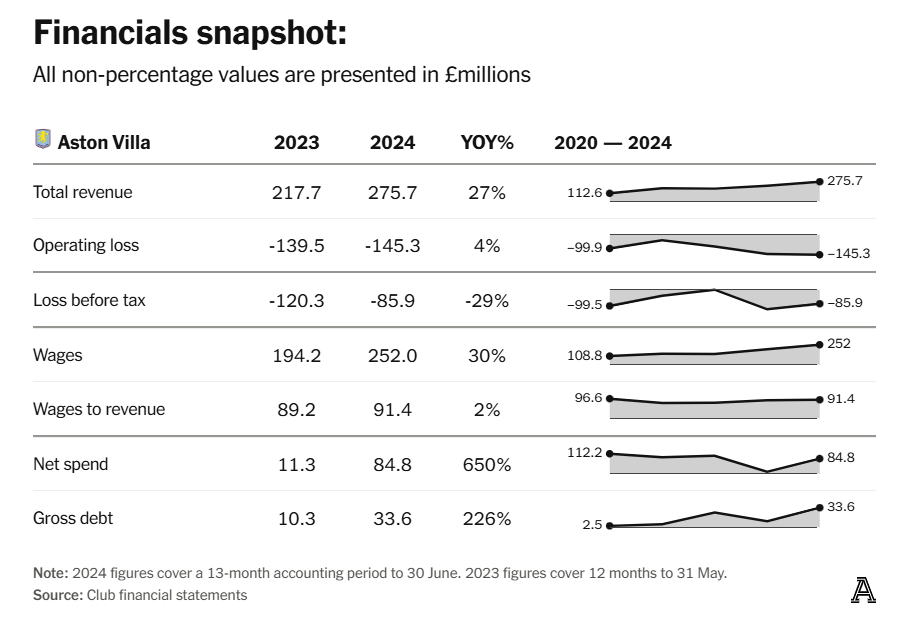 Как мы уже видели, убыток «Виллы» в прошлом сезоне действительно сократился — хотя и благодаря спешной продаже Дугласа Луиса в последний момент. При этом второй год подряд клуб отчитался о рекордной выручке: доходы достигли £275,7 миллиона. И в 2024/25 году ожидается третья подряд рекордная вершина — благодаря затяжному походу по Лиге чемпионов.