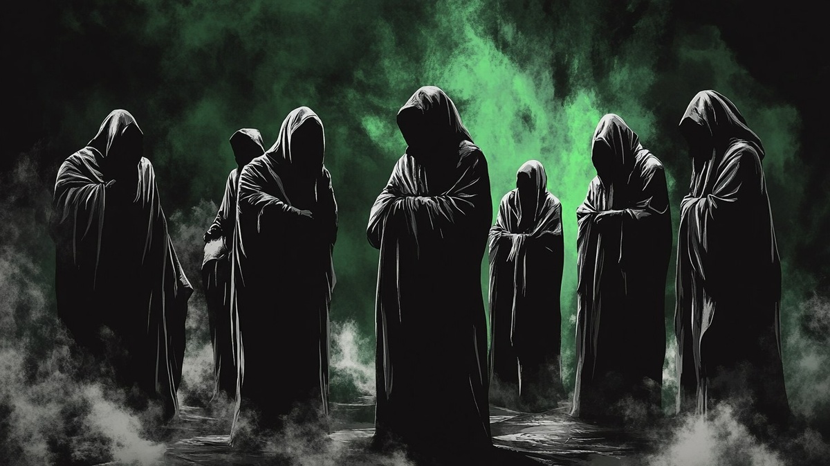 Создано на основе запроса: group of people in robes with hoods standing in a cricle, ritual, dark mood, realistic comic drawing, black