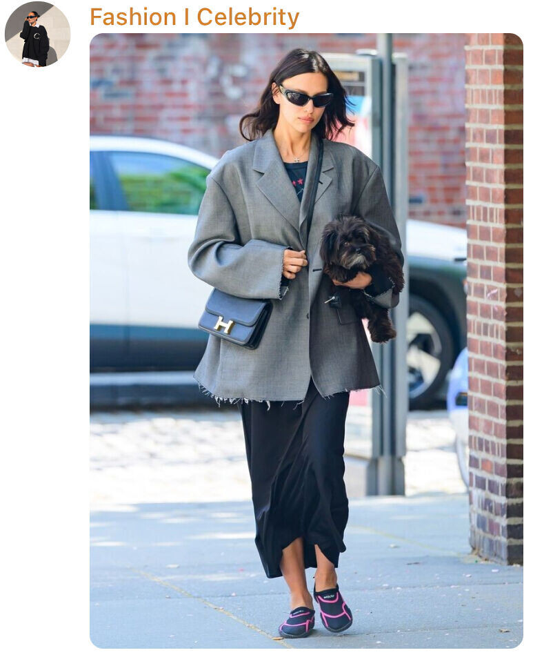 Что ни выход Ирины Шейк, то новый повод для обсуждений. И этот раз — не исключение: папарацци снова подловили модель на прогулке. Фотографии мгновенно разлетелись по Сети, а поклонники тут же начали разбирать детали образа. Я тоже не смогла пройти мимо — слишком уж стильным получился этот аутфит. Для прогулки с собакой Ирина выбрала серый оверсайз-пиджак с эффектом необработанных краев — словно с подиума Balenciaga. Под ним — футболка и свободная черная юбка длины макси. Образ дополнила кожаная сумка Hermes Constance за $ 20 000 и солнцезащитные очки. Неожиданным акцентом образа стали тапочки для серфинга в черно-розовой гамме. По мнению Vogue, обувь, вдохновленная активным отдыхом — от акваботинок до моделей Vibram FiveFingers, сегодня прочно входит в повседневную моду. Комфорт и функциональность становятся важнее классических представлений о красоте. И Ирина это прекрасно понимает: сочетая ультраудобную обувь с элементами высокого стиля, она подает пример, как носить такие пары в гор