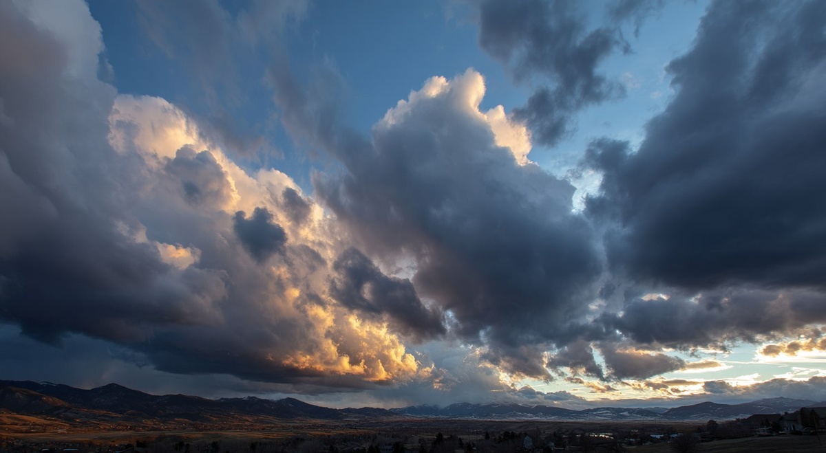 Создано на основе запроса: A low-angle photograph of the sky at dusk, with dark gray clouds in the foreground and light yellow hues peeking