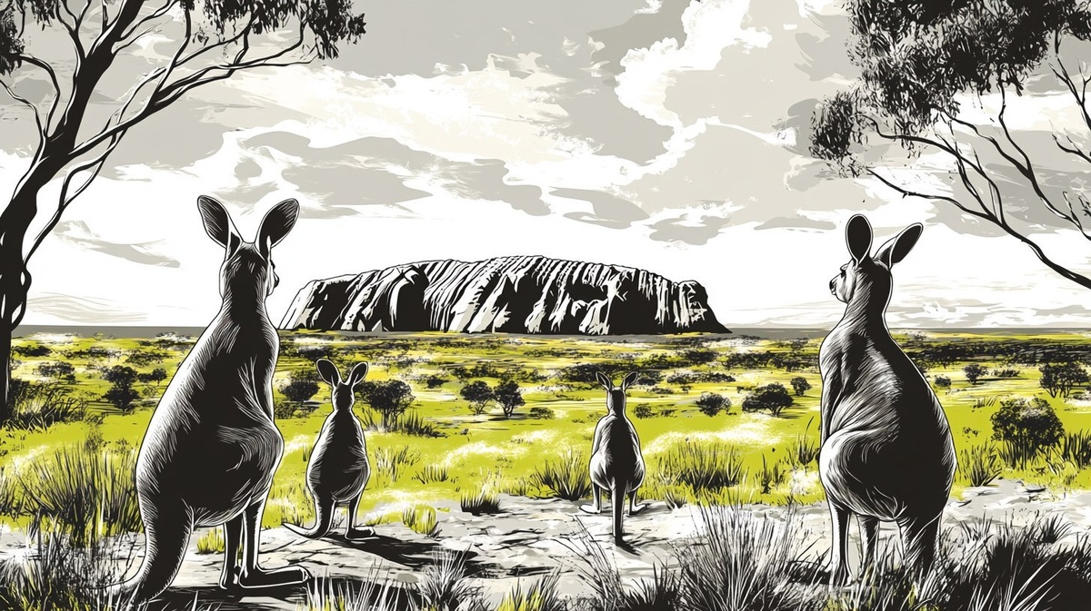 Создано на основе запроса: Kangaroos in front of the ayers rock, realistic comic drawing, black, white and grey, green, 4K