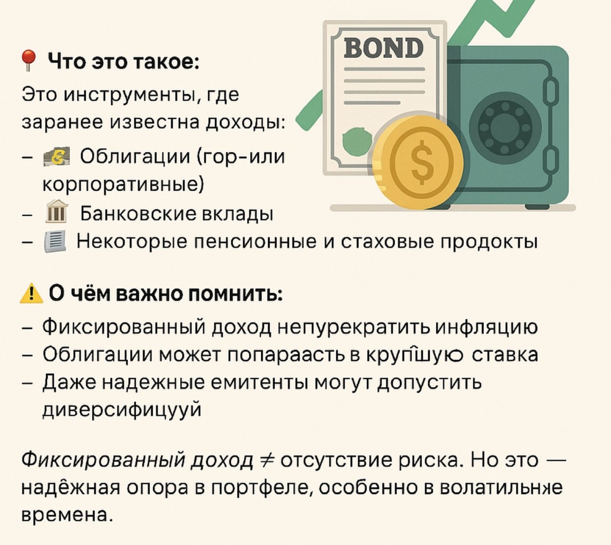 📆 День 15. Активы с фиксированным доходом: облигации и депозиты Инвестировать можно по-разному. Если хочешь стабильности и предсказуемости — тебе подойдут активы с фиксированной доходностью 📉➡️📈 📌 Что это такое? Это инструменты, где заранее известна доходность: – 💵 Облигации (гос- или корпоративные) – 🏦 Банковские вклады – 📜 Некоторые пенсионные и страховые продукты 🧠 Когда они нужны: – При низкой готовности к риску – Если скоро понадобится крупная сумма – Для стабильного денежного потока ⚠️ О чём важно помнить: – У депозита доходность может не перекрывать инфляцию – Облигации могут снизиться в цене при росте ставок – Даже надёжные эмитенты могут допустить дефолт — диверсифицируй 💬 Фиксированный доход ≠ отсутствие риска. Но это — надёжная опора в портфеле, особенно в волатильные времена. 📊 Хорошая стратегия: Сочетать такие инструменты с более доходными, но рисковыми активами — и держать баланс. #день 15 #100днейинвестора Ваша благодарность , поделиться постом
