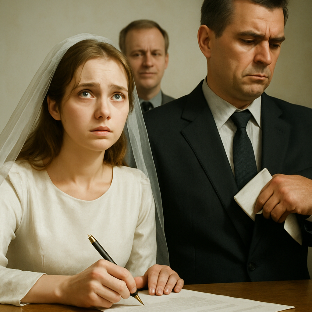 Виктор Николаевич стоял у стола, на котором уныло поблескивали обручальные кольца, с выражением скучающей неизбежности. В мятых стенах загса пахло старыми бумагами и сыростью. Секретарь с натянутой улыбкой монотонно зачитывал текст, и казалось, что никто в этом помещении — ни жених, ни невеста, ни даже сама судьба — не придаёт происходящему никакого значения.