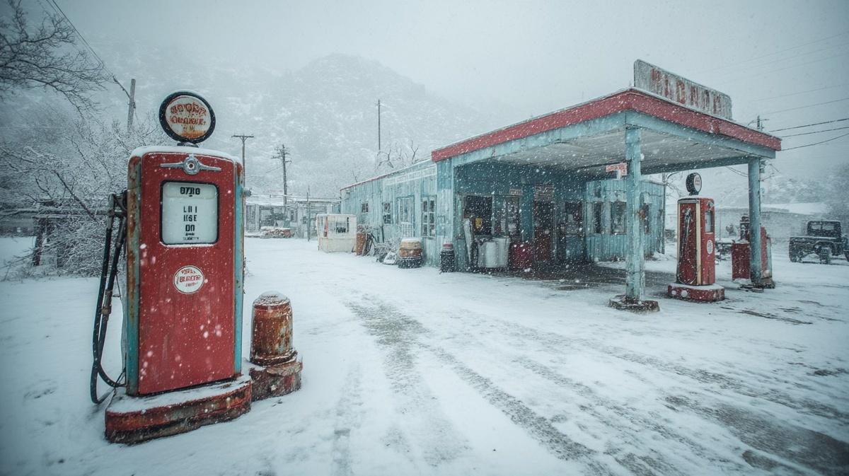 Создано на основе запроса: close-up a gas pump and a full gas station at an abandoned remote northern gas station, snowy, winter, ultra high