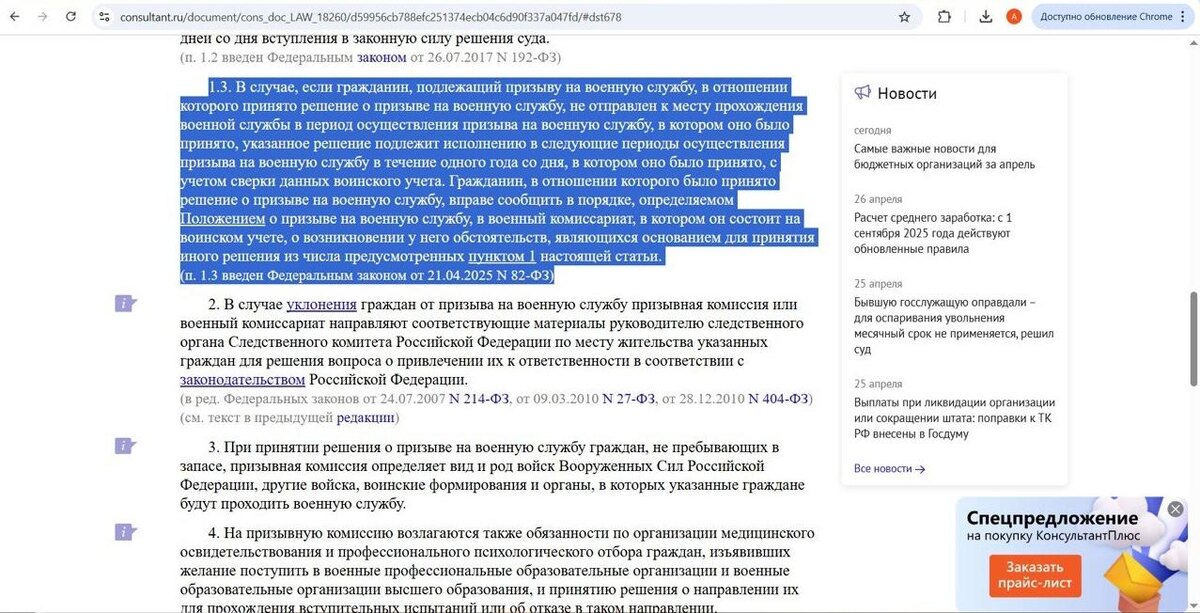 В ответ на пост Всё, и на сайте Консультант+ 53-ФЗ обновился до последней версии, поправки заработали ✔️ Для тех, кто пропустил: запись эфира с разбором изменений есть в закрытом канале.