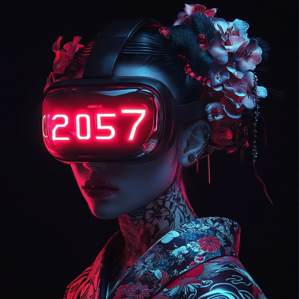 Автоперевод: Гейша в стиле киберпанк с голографическим головным убором и очками виртуальной реальности, демонстрируя текст «2057» в Neon Red на ее гарнитуре VR.