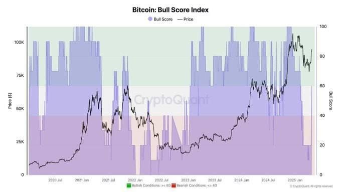 ⬆️ Бычка вернулась? Индекс Bitcoin Bull от Cointelegraph достиг отметки 60 — это чёткий сигнал возвращения оптимизма среди инвесторов. Успеет ли BTC обновить ATH до лета?