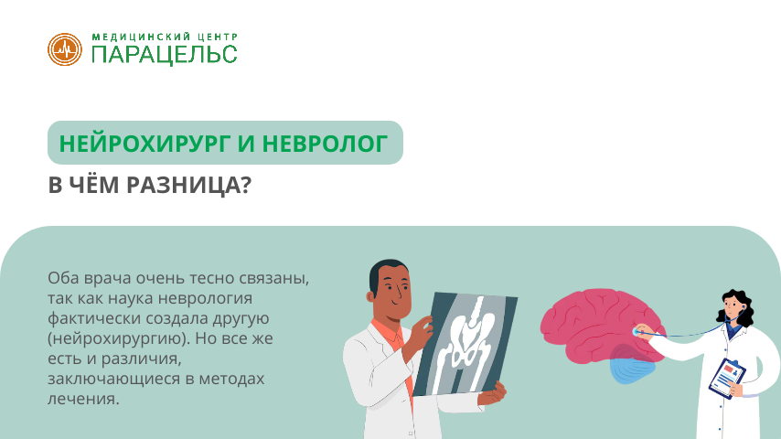☝ Стоит отметить, что оба врача очень тесно связаны, так как наука неврология фактически создала другую (нейрохирургию). Но все же есть и различия, заключающиеся в методах лечения. Сегодня разберемся, кто чем занимается и когда к кому нужно идти. 👨 Невролог занимается диагностикой и лечением болезней нервной системы без операций. Он применяет такие методы лечения, как лекарственная терапия, физиотерапия, массаж и ЛФК, а также другие консервативные методики. 😷 Нейрохирург же наоборот, лечит заболевания нервной системы хирургическим путем. Но стоит понимать, что врач предложит сделать операцию только в случае крайней необходимости: тогда, когда лекарства и терапия становятся бессильны. ❗ Бывают ситуации, когда пациенту могут пригодиться сразу два врача – невролог и нейрохирург, либо кто-то один. Иногда может потребоваться операция, которую проведет нейрохирург, а невролог будет наблюдать за восстановлением пациента. ✅ Напоминаем, что в Медицинском центре «Парацельс» начал вести прием в