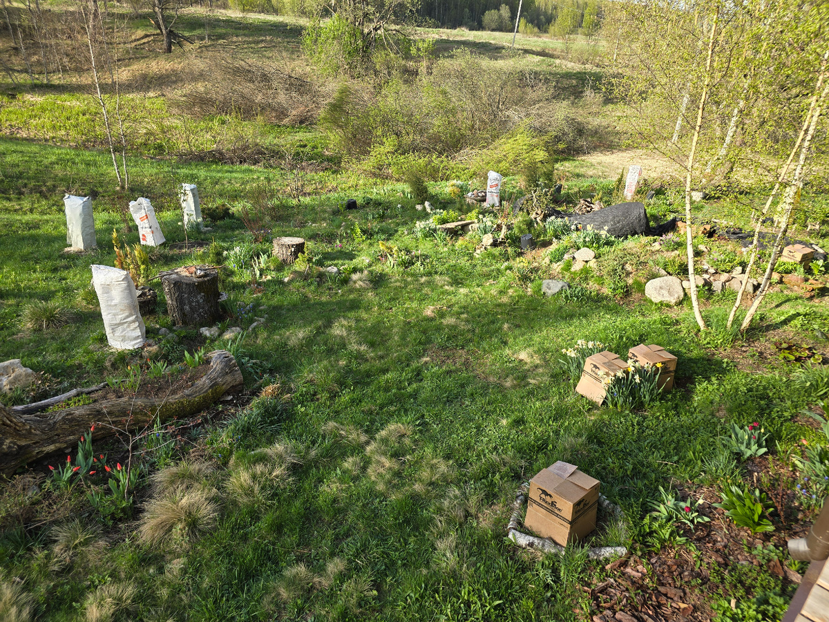 Что могла, я укрыла и укутала. А у сиреней уже такие большие побеги, что укрытием больше сломаешь, чем спасёшь. Да и закончился у меня материал для укрытий.