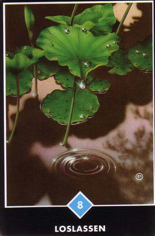 Отпустить себя (8 Воды) В существовании нет высших и низших. Травинка и великая звезда совершенно равны… Но человек стремится быть выше других, он хочет завоевать природу, и значит, ему придется долго бороться. Все сложности возникают из этой борьбы. Невинный человек - это тот; кто отказался от борьбы, кто больше не заинтересован в том, чтобы быть выше, он больше не заинтересован в представлении о себе, в доказательстве того, что он особенный; он становится подобным розе или капельке росы на листе лотоса; он становится частью бесконечности; он растворился, слился и стал единым с океаном, он стал лишь волной; у него нет идеи "Я". Исчезновение "Я" есть невинность. Здесь изображены листья лотоса ранним утром. Мы видим рябь на воде от только что упавшей капли. Это драгоценное, насыщенное мгновение. Сдаваясь силе тяжести и соскальзывая с листа, капля теряет былую индивидуальность и соединяется с бесконечной водой внизу. Мы можем представить, как она, должно быть, дрожала перед падением, на