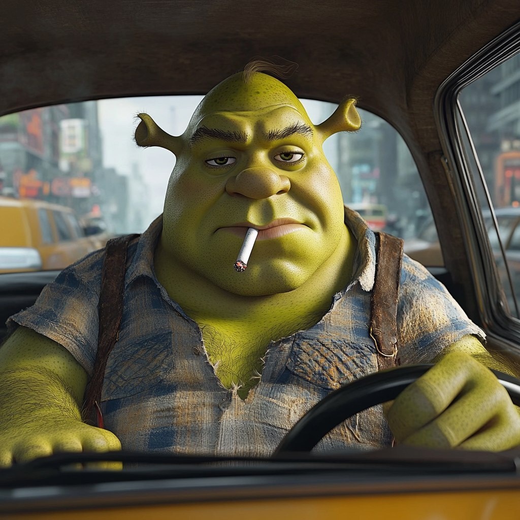 Создано на основе запроса: Create an ultra realistic image of Shrek as a taxi driver driving a taxi in New York City while smoking a cigarette. he is wearing a button up shirt that is open at the top and showing a lot of chest hair. the shot of the image is from the front of the car looking in with a wide view. ultra high quality. give it a background of New York City --- Автоперевод: Создайте ультра -реалистичный образ Шрека в качестве водителя такси, управляющего такси в Нью -Йорке, когда курят сигарету. Классно получилось? 🤔 https://dzen.ru/id/65c0c65c86e4f837c27b24d7 #ИИ #AI #нейросеть #midjourney #art