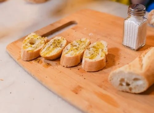 Натри сыр, смешай с измельчённым чесноком и зеленью. Намажь хлеб сливочным маслом, выложи сырную смесь. Запекай в духовке при 180°C 5–7 минут или обжарь на сковороде под крышкой.