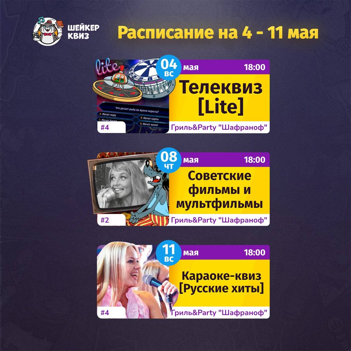 Планируем майские праздники вместе с Шейкер Квиз Телеквиз [Lite] #4 🕐4 мая, 18:00 Советские фильмы и мультфильмы #2 🕐8 мая, 18:00 Караоке-квиз [Русские хиты] #4 🕐11 мая, 18:00 📍Гриль&Party «Шафраноф», ул. Ленина, 77а 🪙500 рублей 🔑зарегистрировать команду от 1 до 10 человек можно по ссылке в VK #Афиша Предложить публикацию @zabkulisye_bot