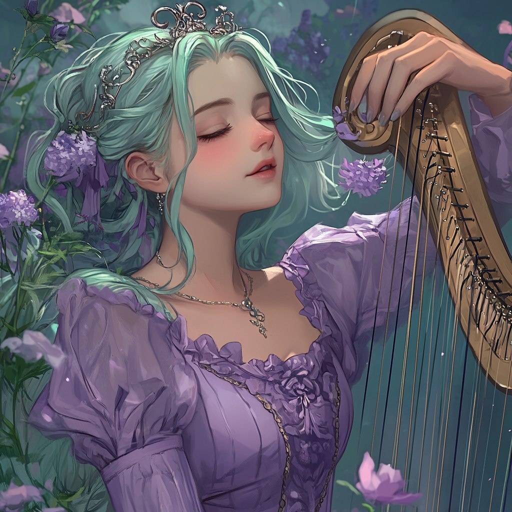 Создано на основе запроса: a young woman in her teens with mauve hair and sea green highlights, holding a harp She is wearing a violet gown with lilac and purple accents, reaching down to pick a flower. Her expression is dreamy, and she has a soft smile. Wearing a silver crown with the Pisces symbol on it. Art style is cartoon like.