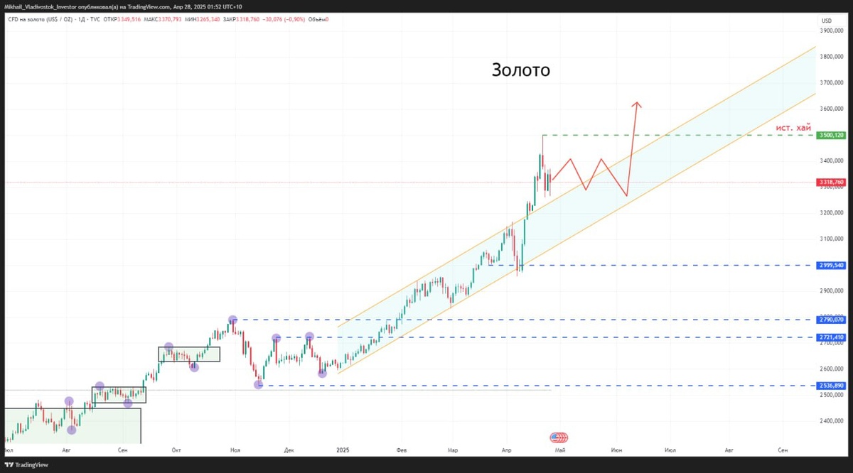 МЕТАЛЛЫ Тот же сценарий, что неделей ранее Золото GOLD $GDM5 Таймфрейм дневной Обновили снова исторический хай уже сегодня. Теперь это отметка 3500. Можем конечно после такого сильно роста уйти в коррекцию, но... В любом случае тренд восходящий, поэтому ищем только лонги. И даже не пытайтесь краткосрочно вставать в шорт. Я думаю вы уже заметили, которую неделю пишу не шортите и цена летит всё выше и выше. Бегать за несчастными короткими движениями смысла нет. Причиной коррекции думаю может стать ослабление напряженности между США и Китаем, а так же рост рынка США. Платина $PTM5 Таймфрейм дневной Расторговываемся в боковике. После таких агрессивных продаж я бы искал только инвестиционные покупки через бессрочные контракты. Ну а для спекуляций необходимо выходить выше 1040 и закрепляться. Пока так... Палладий $PDM5 Таймфрейм дневной В левой части графика агрессивные продажи(стрелкой показал). Пока находимся внутри них, продолжаем искать шорты. Если покупки, то только инвестиционны