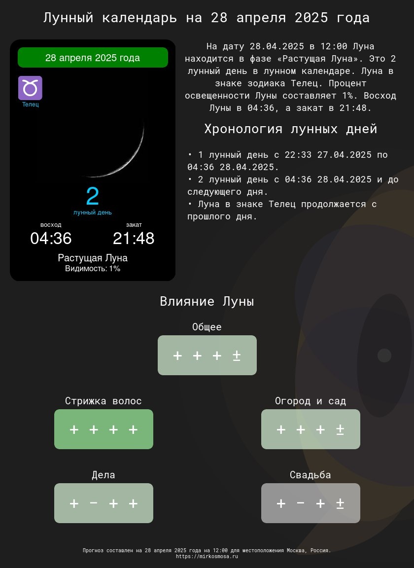🔹🌗 Лунный календарь на 28 апреля 2025 года — Что приготовила Луна? Подробнее