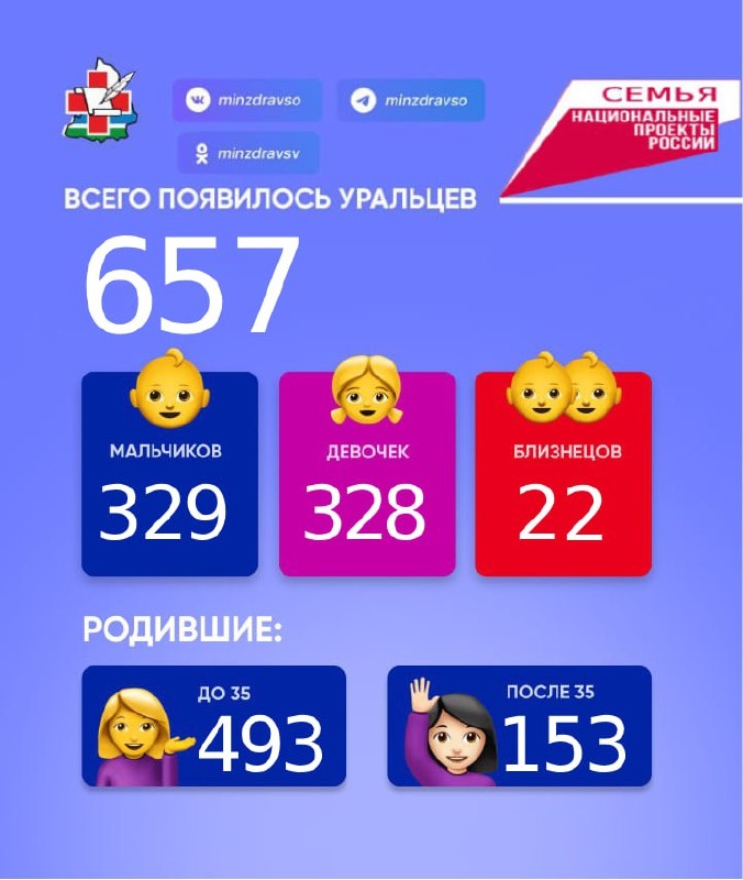 Радостной статистики пост! 🤱За прошедшую неделю в Свердловской области на свет появились 657 малышей: 💙329 мальчиков и 328 девочек💖, из них 11 пар близнецов. 493 мамы родили до 35 лет. 153 мамочки родили после 35 лет. 👨👩👧👦 Для двух свердловчанок это были седьмые по счету роды, а 40 новорожденных стали четвертыми детьми у своих мам.🏅 Поздравляем! 📱Подписаться, чтобы узнать больше