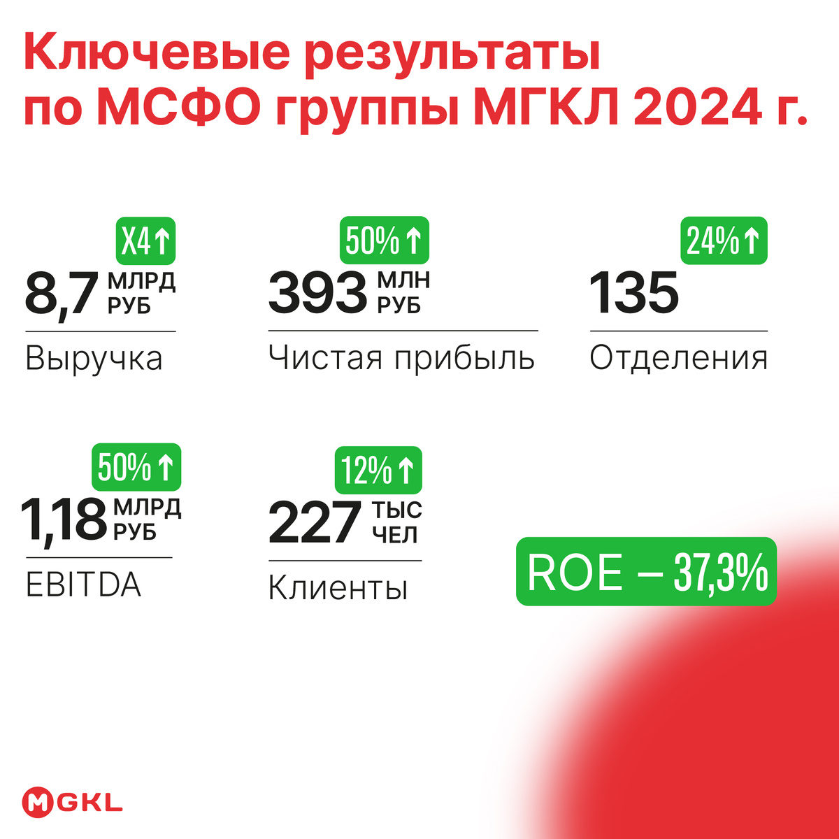 «2024 год стал для Группы МГКЛ годом качественного роста и трансформации. Мы превзошли прогнозы аналитиков по ключевым показателям, вышли в технологичный сегмент ресейла, сохранили и укрепили сильную базу в ломбардном бизнесе. Сегодня нас поддерживают уже более 37 тысяч инвесторов, и это лучшая оценка нашей стратегии. Доля ломбардного сегмента в EBITDA по итогам 2024 года составляет менее 50%, что отражает стратегическое движение в сторону гораздо более емкого направления - ресейла, а также позволяет применять более релевантные методологии рейтинговых агентств.. В соответствии с нашим бизнес-планом в 2030 году выручка может достигнуть 32 млрд рублей. Показатель ROE 37,3% — прямое отражение эффективности построенной бизнес-модели».