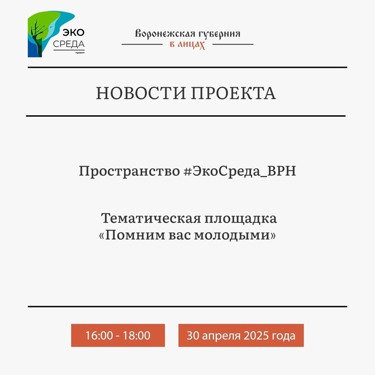 🌟 Уникальное мероприятие в рамках проекта «Воронежская губерния в лицах. Истории, которые вдохновляют»! 📅 30 апреля в 16:00 в пространстве #ЭкоСреда_ВРН мы вспомним о маленьких, но не менее важных героях Великой Отечественной войны в преддверии празднования 80-летия этого события. 📍 Адрес: г. Воронеж, пр-т Революции, 35 Штаб общественной поддержки Воронежской области (https://vk.com/club220349174) 👦👧 Мероприятие, посвященное памяти юных героев Воронежа, защитивших наш город, будет презентовано ассоциированной школой ЮНЕСКО АНО ДО «Интерлингва» в рамках проекта «Помним вас молодыми». 🎥 Программа мероприятия: 1. Первая часть: 📽 Видео рассказ «Дети мира о детях Великой Отечественной войны» — уникальный проект о воронежских подростках, созданный учащимися школы «Интерлингва» в сотрудничестве с другими учебными заведениями. 2. Вторая часть: 📚 Доклады в рамках проекта «Помним вас молодыми» под руководством Павла Печкурова. 🎉 Завершение мероприятия: 🎲 Интерактивная игра, раз