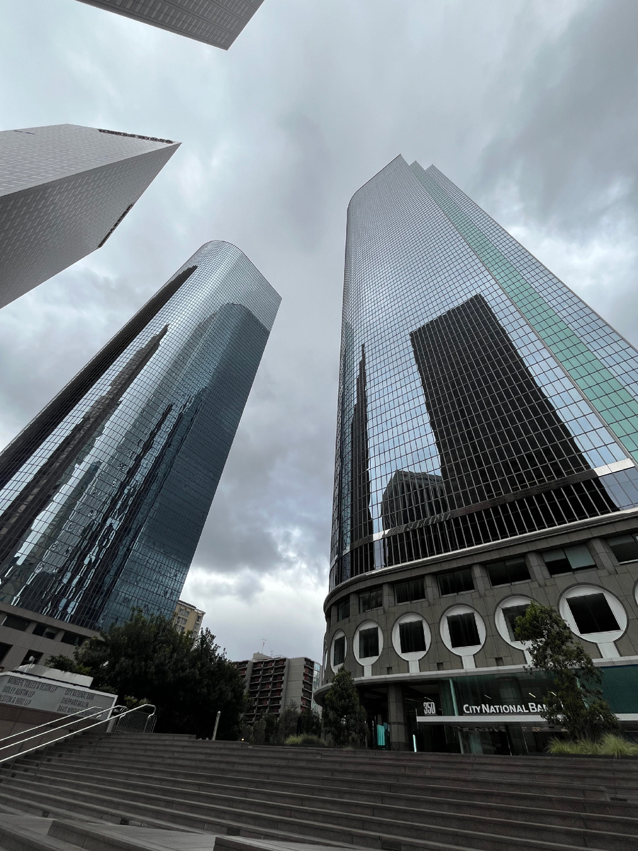 На фото — небоскрёбы в центре Лос-Анджелеса. Это район Downtown, часть комплекса Wells Fargo Center и зданий вокруг US Bank Tower.