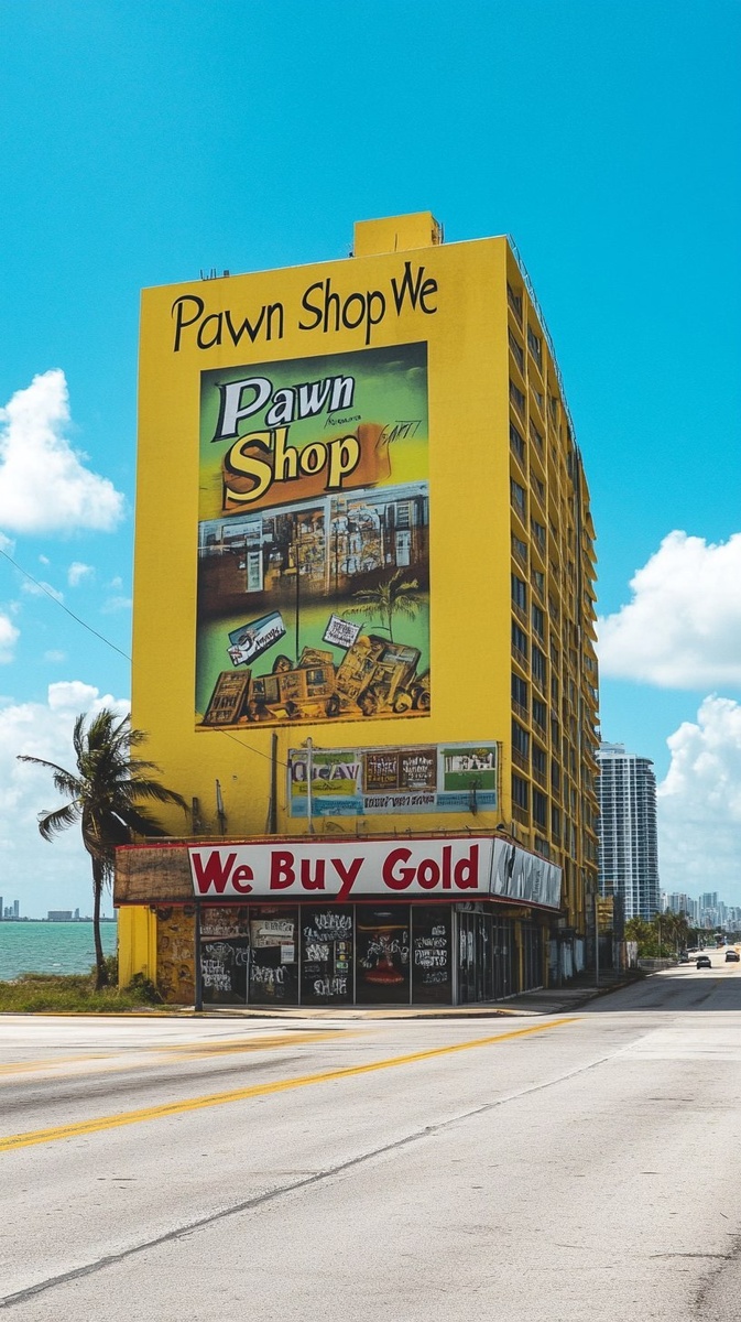 Создано на основе запроса: a photograph of a 20 story yellow Miami high rise building that is yellow and covered with advertisements. Signs read "Pawn Shop" and "We Buy Gold". The ocean is in the background. The sky is sunny with a few clouds. Sony A65 camera.