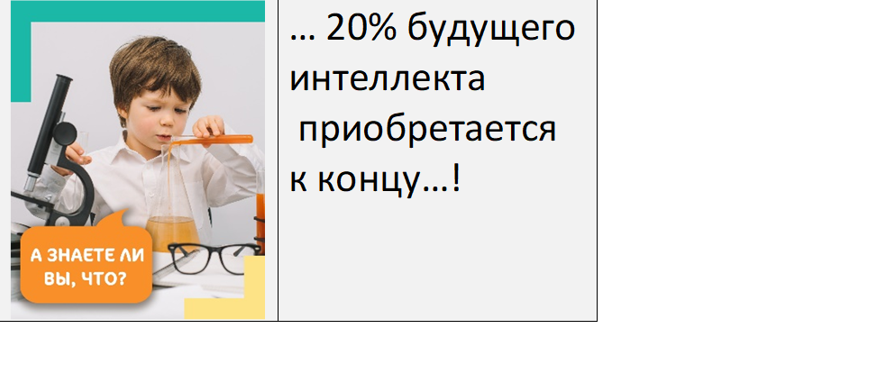 🔥 Научные исследования показывают, что 20% интеллектуального потенциала ребенка формируется уже к концу первого года жизни. К четырем годам эта цифра достигает 50%, к восьми годам — 80%, а к тринадцати годам ребенок приобретает около 92% своего будущего интеллекта. 😮 Родитель – скептик. Блин, а моему ребенку уже 14 лет!!! Мы упустили время! Все пропало! 😐 Эксперт по воспитанию. Ничего не пропало. У вашего ребенка все впереди. 🖍️Выше приведенные данные являются средними статистическими показателями, и каждый ребёнок развивается индивидуально, однако игнорировать этот важный научный факт родители не должны. Конечно, особое внимание следует уделять дошкольному возрасту, поскольку именно этот период играет ключевую роль в развитии интеллекта ребенка. Но, это не означает, что время упущено полностью. Начинать развивать интеллект можно в любом возрасте, даже после 70-ти лет. ❗ Знайте. Курсы Академии развивают у слушател