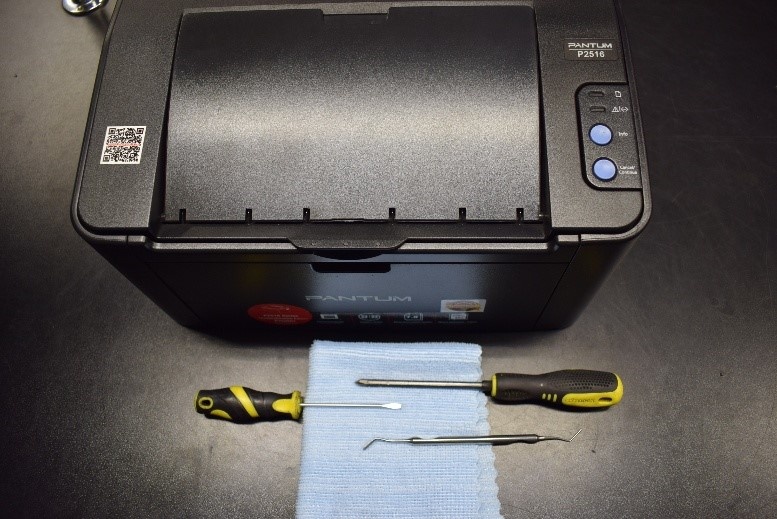 Первым делом подготовим рабочие инструменты. Открываем верхнюю крышку, вынимаем картридж из принтера. Откручиваем сверху, слева болт, с помощью крестовой отвёртки.