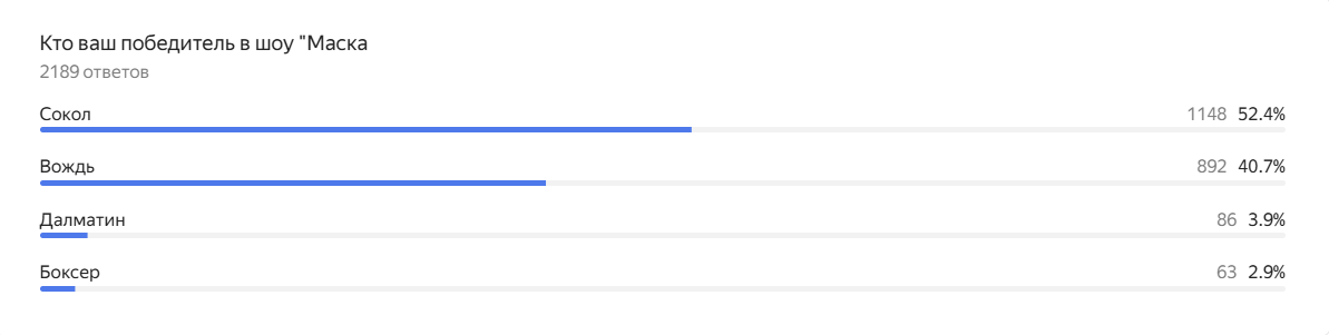 В этой статье я предложила вам проголосовать за тех, кого вы видите победителями шоу. По "Голосу" я уже публиковала результаты голосования вот здесь: А по "Маске" и "Трем аккордам" размещаю сейчас. Вы видите, что произошло? Если бы победителя выбирали путем зрительского голосования - победителем мог бы стать Сокол. Он довольно серьезно опережает Вождя в нашем с вами голосовании. В то же время Вождь и Сокол находятся в серьезном отрыве от двух других участников. То есть, 1 и 2 места по вашему мнению - железно у них. Далматин же в вашем голосовании сильно отстает от них обоих и держит третье место. Получается, голосование совпало лишь по 4 месту - туда вы, как и жюри, поместили Боксера. А первая тройка в нашем голосовании отличается от той, что была выбрана жюри на вчерашнем финале. Что вы об этом думаете? Напишите в комментариях, какое голосование вам кажется наиболее справедливым - наше с вами или то, которое было у жюри на проекте? И здесь у нас тоже результат, который отличается от