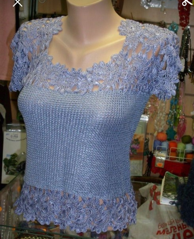 Всем здравствуйте! Сегодня хочется спросить у вас увлекаетесь ли вы ажурным вязанием крючком? Если да , то вам для вдохновения фото кофточки . Посмотрите как нежно смотрится кофточка. Верх и низ кофточки оформлен ажурными лентами. Верх вообще меня очаровал. Прелесть ,нежность особенно в голубом цвете связать или в розовом а если в белом будет как говорят ,,отпад,, Конечно труд не маленький. Но выложить , соединить ленты по верху кофточки смогут не такие уж крутые вязальщицы. Ленты ажурные и они легко лягут по телу. Рукава это продолжение ленты. Я бы вязала так. Основную деталь по телу кофточки можно вязать и спицами и крючком. Вяжем ровно до подмышек перед и спинку. Затем решаем какой вырез будет по спинке. Для девочек , девушек можно оставить глубокий вырез ,будет думаю красиво. Молодая загорелая спинка смотрится совсем не вульгарно . Для этого плотную , не просвечивающую вязку вяжем ровно по переду и спинке , далее присоединяем горизонтально ажурные ленты по переду и спинке . Для п