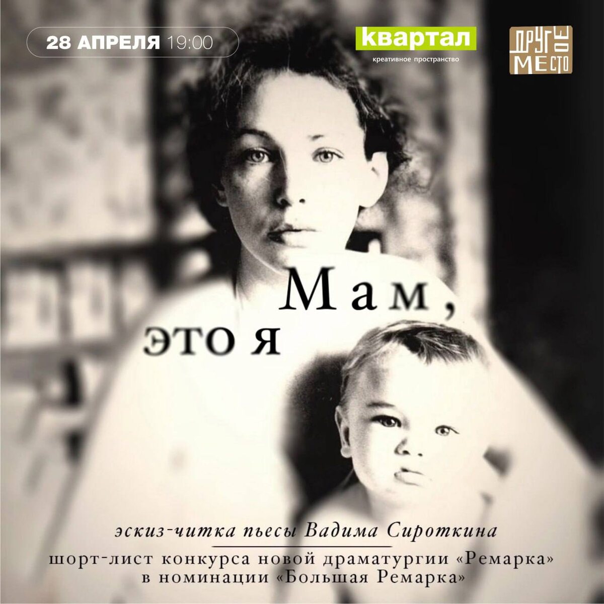 Арт-группа Другое место представляет: Эскиз-читка пьесы Вадима Сироткина «Мам, это я» 🗓️ 28 апреля, 19:00 📍Квартал, Ленина 78 «Мам, это я» — история о поиске ответов в абсолютной тишине недосказанности. Пьеса рассказывает о трёх поколениях одной семьи, объединённых несвоевременностью важных признаний. В 2024 году пьеса «Мам, это я» вошла в шорт-лист конкурса новой драматургии «Ремарка» в номинации «Большая Ремарка». Регистрация и подробности тут. #28апреля25