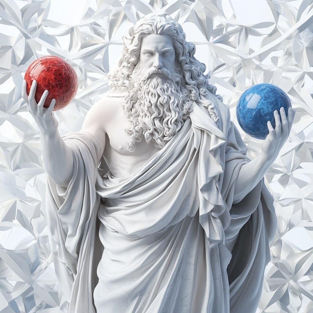 Создано на основе запроса: A marble statue of a greek god holding a red sphere in the left hand and a blue sphere in the right hand, dressed