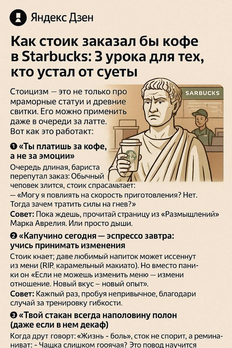 Стоицизм — это не только про мраморные статуи и древние свитки. Его можно применить даже в очереди за латте. Вот как это работает: