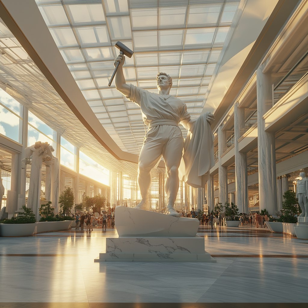 Создано на основе запроса: A white marble statue in the style of Socialist Realism, the marble statue is a man dressed in work cloths holding up a hammer triumphantly standing on a neo-classical pedestal, the statue is in the middle of a busy futuristic neo-classical style atrium , early evening sunset, 4K, hyper-realistic, high detail --- Автоперевод: Статуя белого мрамора в стиле социалистического реализма, мраморная статуя-это человек, одетый в рабочие ткани, держащие молоток триумфально стоящим на неоклассическом пьедестале, статуя находится в середине оживленного футуристического неоклассического атриума, ранний вечер, 4K, гиперреалистичный, высокий детал. Классно получилось? 🤔 https://dzen.ru/id/65c0c65c86e4f837c27b24d7 #ИИ #AI #нейросеть #midjourney #art