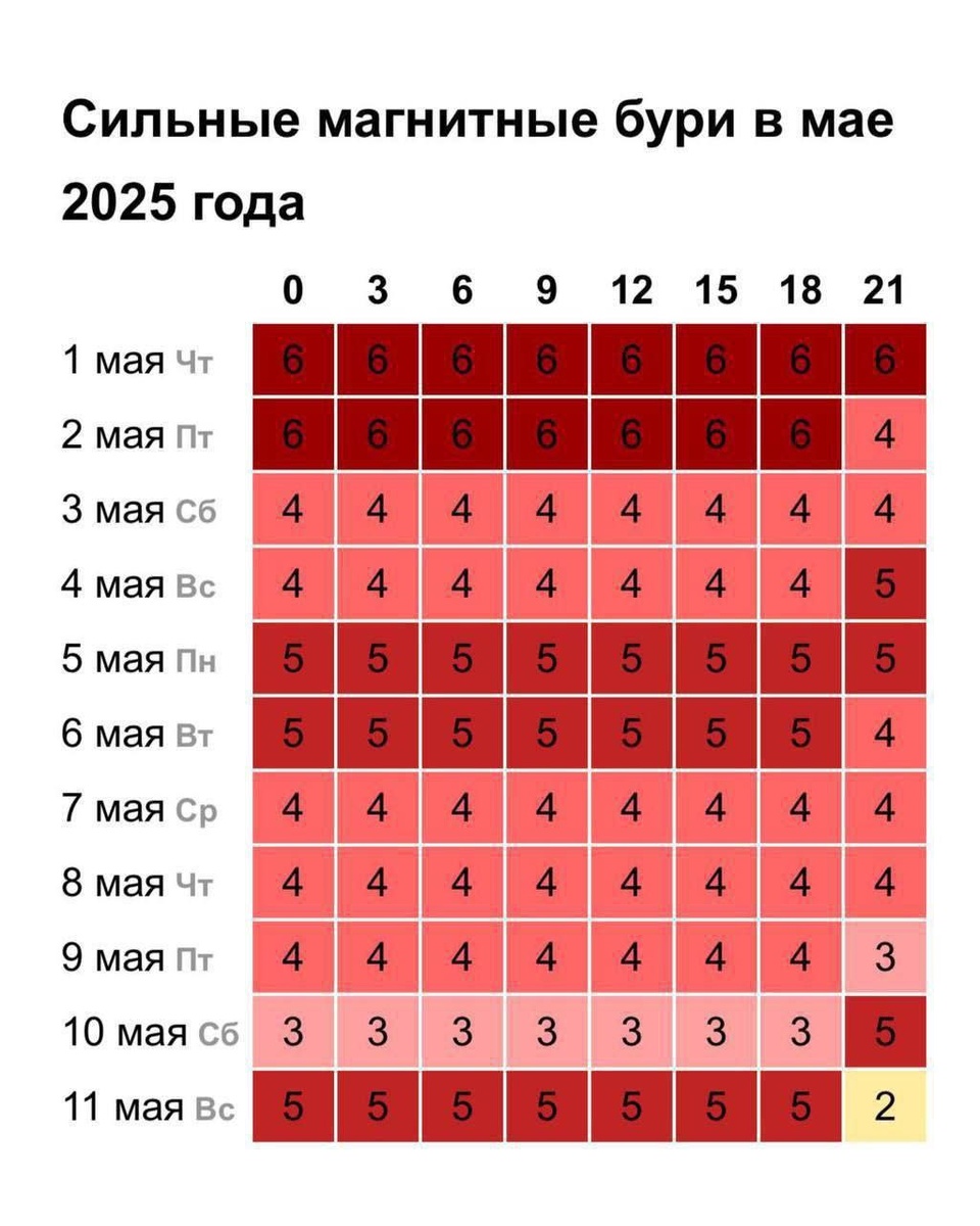 В начале майских праздников ожидаются сильные магнитные бури. В период магнитных бурь у некоторых людей могут возникнуть головные боли, общая слабость и недомогание. В такие дни рекомендуется больше отдыхать и ограничить физические нагрузки.