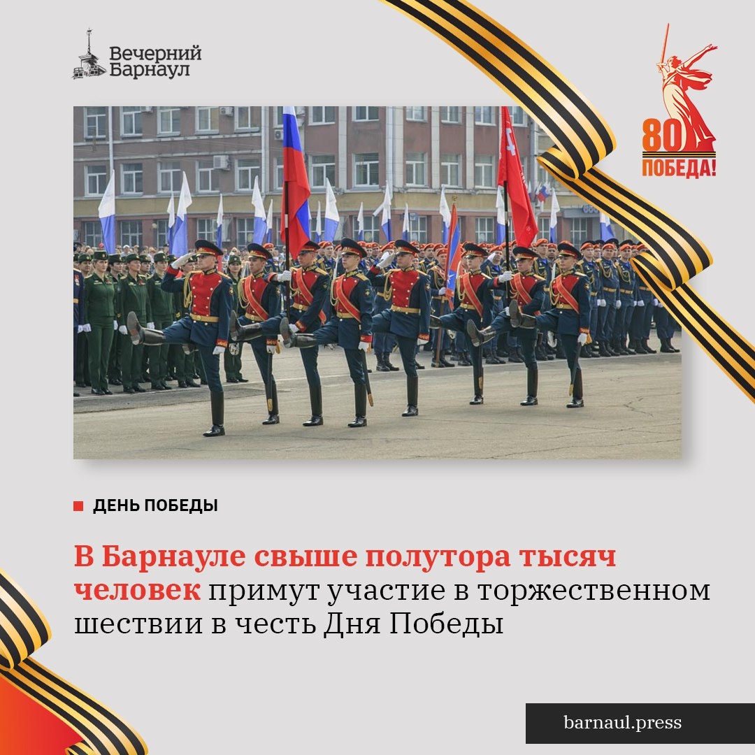 ⭐ 9 мая в краевой столице состоится парад Победы. Торжественное построение войск Барнаульского гарнизона пройдёт на площади Советов. В параде примут участие знамённые группы, парадные расчёты, сводный военный оркестр и линейные. Общее количество, которое будет участвовать в торжественном шествии, составит 1564 человека. Помимо парада в этом году значимым событием станет шествие «Бессмертного полка». Оно стартует после торжественного прохождения войск Барнаульского гарнизона. День Победы в краевой столице завершится праздничными салютами, которые запустят во всех районах города. @barnaul