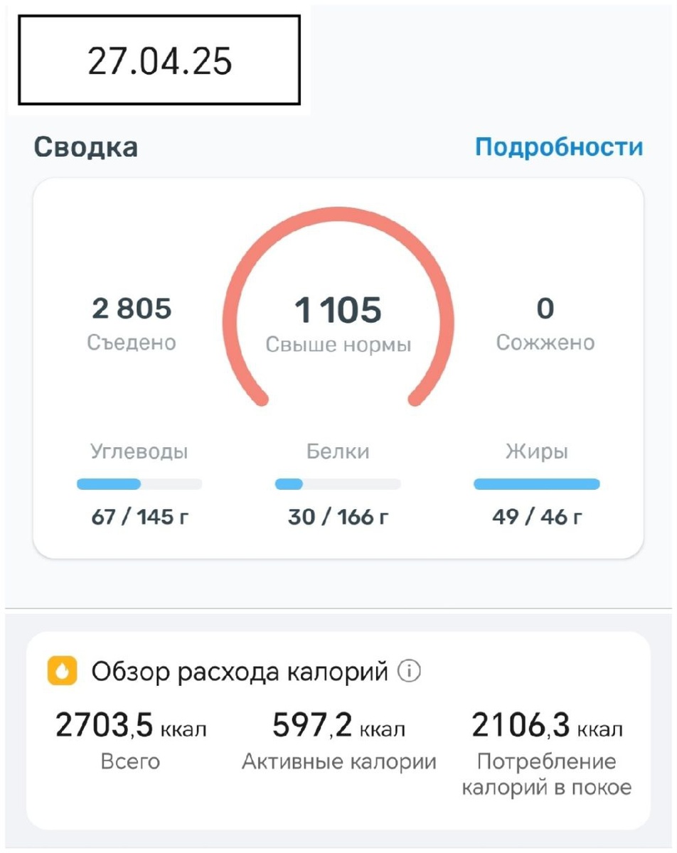 📊 Итоги вчерашнего дня. 🗓 27.04.25 💪 День ведения блога: 109 ➕ Съедено: 2805 ккал ➖ Расход (покой) : 1772 ккал ➖ Расход (активный) : 597 ккал 🟰 Итог: +436 ккал за день. Оценка дня: "Слабак, сдался?" 🤦♂️ Эти выходные выдались убойными... 🤦♂️ Вчера из активностей был только бильярд утром, потом заехал на чай к родственникам, дальше 2 часа дороги домой за рулем, а потом на такси поехали в ресторан праздновать день рождения друга. *️⃣Цифра "осталось" на фото - это сколько ещё можно съесть, чтобы выйти в 0 за день. Но мы будем считать дневной расход в покое по цифре, которую выдают весы. Мне кажется, что весы учитывают больше параметров и там цифра расхода калорий в покое точнее. 🤔 На мой взгляд для оптимального похудения "+..." - это "Слабак, сдался?" "- <1000" -это "Можно было и лучше" "- 1000" - это "Хорошо" "- 1500" - это "Отлично" "-2500" - это "Жесть я машина! Главное не помереть!" Так что, такую систему оценки и введем! ✍️ Пишите свои калории за день! #калориии_за_